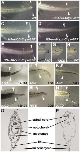 (C) Tadpoles transgenic for the HSP70-NICD-γCrys-GFP construct partially regenerate their tails, reforming the spinal cord and notochord.
