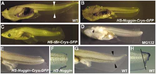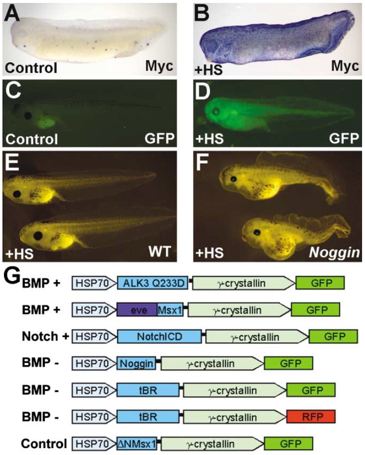 (E and F) Embryos heat-shocked at stage 14 develop normally in the absence of the HSP70-Noggin-γCrys-GFP transgene, whereas their transgenic siblings develop multiple defects consistent with BMP inhibition.