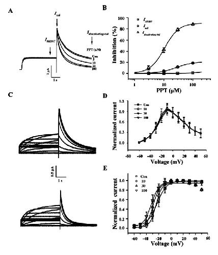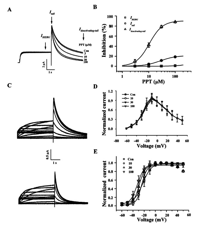 Fig. 3. Effects of protopanaxatriol (PPT) on IHERG, Itail, and Ideactivating-tail. (A) Representative current traces on human ether-a-go-go-related gene (HERG) K+ channel inhibitions by various concentrations of PPT. Currents were in response to 4-s voltage steps to 0 mV from a holding potential of –90 mV, followed by repolarization to –60 mV. IHERG was obtained at the end of depolarization; Itail was obtained at beginning of repolarization; slow Ideactivating-tail was obtained at the end of repolarization as indicated by the arrow. (B) Concentration-response curves for the inhibition of HERG K+ currents by PPT on IHERG, Itail, and Ideactivating-tail. Solid lines were fitted to the Hill equation. PPT was potent for the inhibition of Ideactivating-tail. Bars represent the means±SEM (n=5-7). (C) The representative control (upper traces) and 100 μM PPT-mediated currents (down traces) in I-V relationship. Currents were recorded at test potential from –60 to +50 mV. Itail and Ideactivating-tail were recorded after repolarization to –60 mV. (D) I-V relationships for HERG K+ currents measurement at the end of the 4-s test pulse before and after application of 3, 10, and 30 μM PPT (n=5). Currents were normalized to the control current at 0 mV for each oocyte. Data are represented by the means±SEM (n=7). (E) Effects of PPT on the steady-state activation curve for HERG K+ channel. Itail were normalized to the peak current under each condition, and the data were fitted with a Boltzmann function. Treatment of PPT (3, 10, and 30 μM) did not cause a leftward shift. Con, control.
