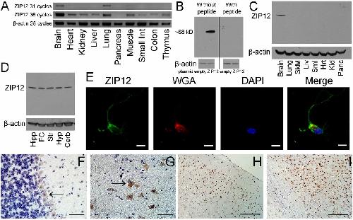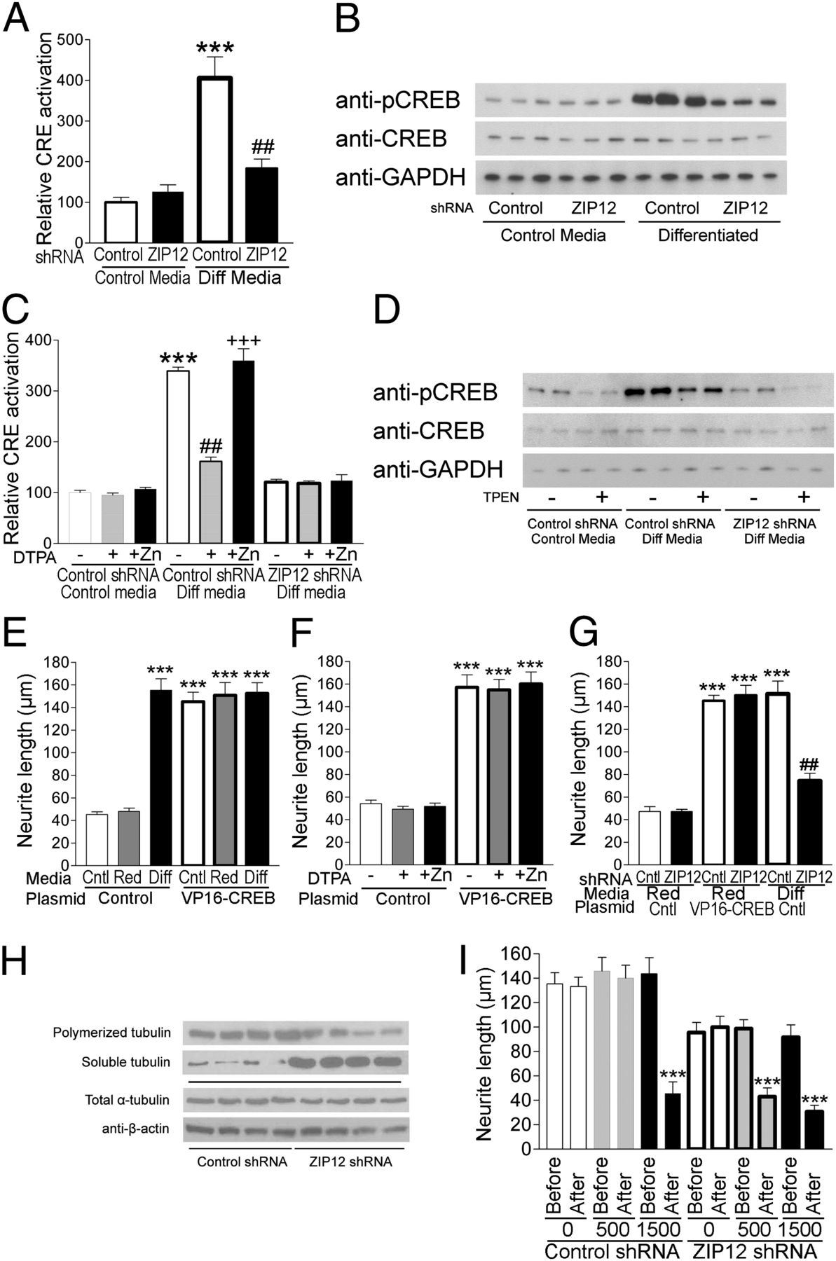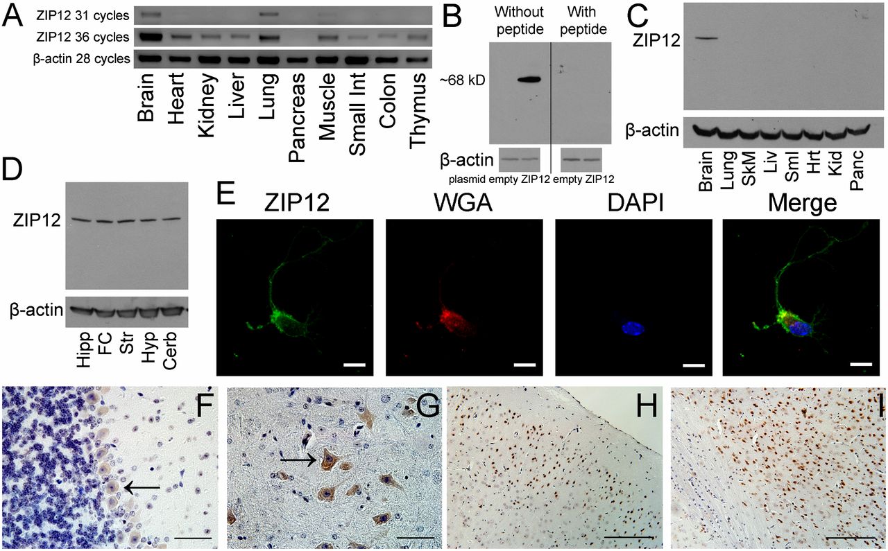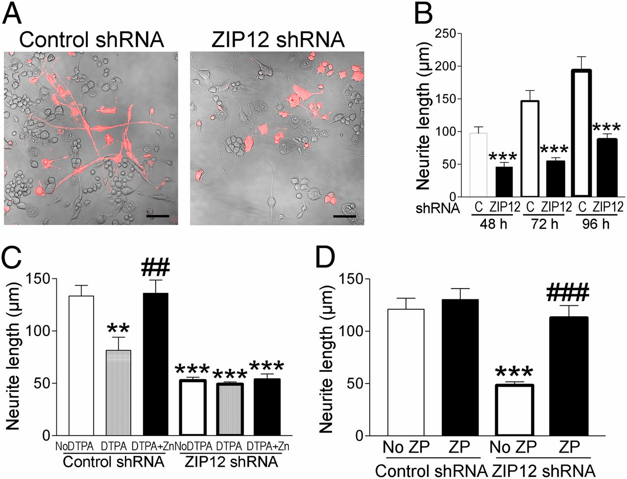 Zn(2+) is required for many aspects of neuronal structure and function. However, the regulation of Zn(2+) in the nervous system remains poorly understood. Systematic analysis of tissue-profiling microarray data showed that the zinc transporter ZIP12 (slc39a12) is highly expressed in the human brain. In the work reported here, we confirmed that ZIP12 is a Zn(2+) uptake transporter with a conserved pattern of high expression in the mouse and Xenopus nervous system. Mouse neurons and Neuro-2a cells produce fewer and shorter neurites after ZIP12 knockdown without affecting cell viability. Zn(2+) chelation or loading in cells to alter Zn(2+) availability respectively mimicked or reduced the effects of ZIP12 knockdown on neurite outgrowth. ZIP12 knockdown reduces cAMP response element-binding protein activation and phosphorylation at serine 133, which is a critical pathway for neuronal differentiation. Constitutive cAMP response element-binding protein activation restores impairments in neurite outgrowth caused by Zn(2+) chelation or ZIP12 knockdown. ZIP12 knockdown also reduces tubulin polymerization and increases sensitivity to nocodazole following neurite outgrowth. We find that ZIP12 is expressed during neurulation and early nervous system development in Xenopus tropicalis, where ZIP12 antisense morpholino knockdown impairs neural tube closure and arrests development during neurulation with concomitant reduction in tubulin polymerization in the neural plate. This study identifies a Zn(2+) transporter that is specifically required for nervous system development and provides tangible links between Zn(2+), neurulation, and neuronal differentiation.