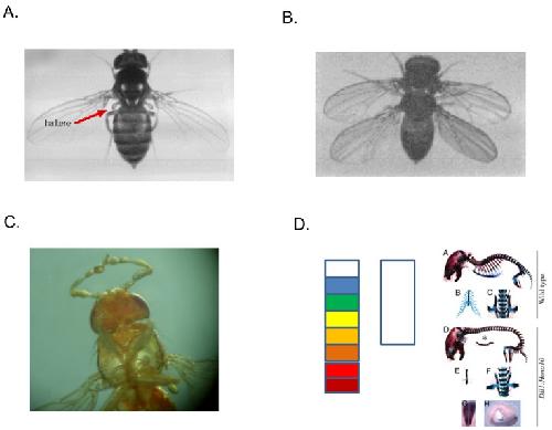 Fig. (1). Hox gene phenotypes. The function of Hox genes is defined by gain and loss of function phenotypes. The figure shows this in Drosophila and vertebrates. A. A wild type Drosophila fly This has two wings on the anterior thorax and two halteres (red arrow) on the posterior thorax. B. A four winged fly, caused by a loss of function mutation in ultrabithorax, a gene for posterior thorax [1]. The halteres are transformed to wings. C. Antennapedia mutation: mid thoracic legs replace antennae on the head, due to a misregulated gain of function mutation for the gene Antennapedia (a gene for mid thorax), leading to its expression in the head segments [2]. D. In vertebrates, mouse genetics has been bedevilled by the fact that there are 4 Hox clusters, with parallel functions. This once led to the erroneous idea that vertebrate Hox loss of function mutations have mild phenotypes. In fact, if you knock out all of the paralogues of a particular vertebrate Hox paralogue group (pg), or ectopically express a Hox gene this can give a dramatic phenotype. Left: diagram of wild type Xenopus hindbrain. This has 8 segments (rhombomeres) 2-8 each express a different combination of Hox genes and so have different identities, indicated by the different colours. 1 (white) expresses no Hox genes. Its identity is determined by the gene Gbx2. Middle: hindbrain in Xenopus where Hox pg1 has been knocked down using morpholinos. The hindbrain is drastically anteriorised to the identity of r1. It is also shorter (redrawn from [3]). Right: Skeletons of two mice. Above: wild type. Below, a mouse ectopically expressing HoxC10. The HoxC10 mouse is drastically different. For example, it lacks ribs [4]. The thoracic vertebrae are posteriorised to abdominal identity. This is because Hox pg10 controls the transition from thorax to abdomen, in the vertebral column. |