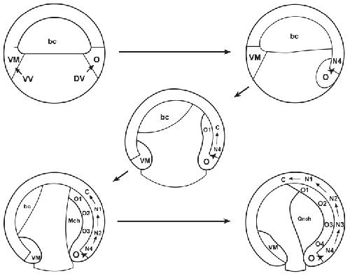 Fig. (3). The vertebrate A-P pattern is initiated during gastrulation. Drawings from an Amphibian embryo. From [9]. Top left, late blastula stage, just before gastrulation. Top right and the rest: successive stages through gastrulation, in the order indicated by the arrows. VM: ventral mesoderm, O: organiser mesoderm. VV: ventral endoderm DV: dorsal endoderm. Bc: blastocoels, arch: archenteron. O1, O2, O3, O4 successive A-P levels generated in the mesoderm during gastrulation, from anterior to posterior N1, N2, N3, N4: successive A-P levels in the developing central nervous system, generated in parallel with the mesodermal pattern by vertical signalling. |