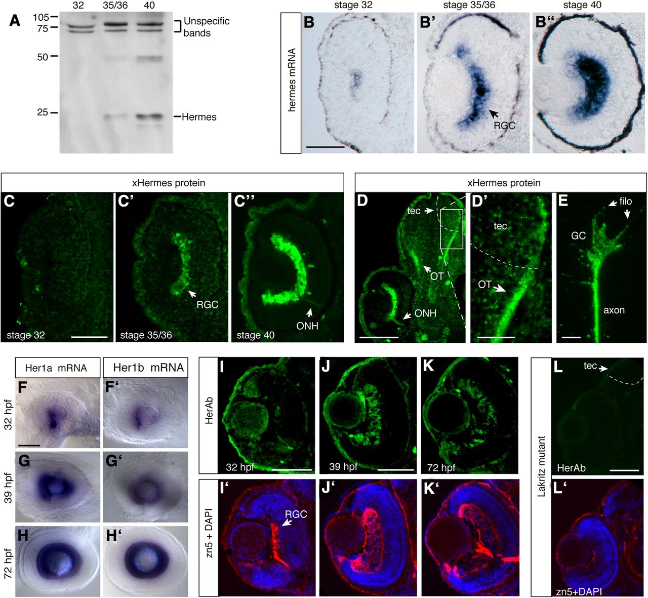 Figure 1. RGC-specific expression of Hermes in Xenopus and zebrafish. A, Western blot analysis of Xenopus embryo head lysates using an anti-Hermes antibody detects Hermes protein expression from Stage 35/36 onward. BâBâ², ISH staining of Xenopus retinal transverse sections shows that hermes signal in RGCs begins at Stage 32 (B) and increases progressively at Stages 35/36 (Bâ²) and 40 (Bâ²). CâCâ², Immunostaining detects no Hermes protein expression at Stage 32 (C) and a progressively stronger signal in RGCs at Stages 35/36 (Câ²) and 40 (Câ²) in Xenopus retinal sections. D, Dâ², Immunostained Hermes-positive RGC axons are visible in the ONH in the retina (C, D), in the region of the OT (D), and tectum (tec) (Dâ²) in transverse sections through Xenopus brain at Stage 40. E, Immunostaining of Xenopus eye explants cultured at Stage 35/36 for 24 h detects strong Hermes expression in growth cones and filopodia (filo). FâHâ², Whole-mount ISH staining on embryonic zebrafish eyes shows that expression of both hermes genes (Her1a and Her1b) follows the wave of RGC differentiation, beginning at 32 hpf (F, Fâ²) and progressing across the whole retina by 39 hpf (G, Gâ²) and 72 hpf (H, Hâ²). IâKâ², Zebrafish retinal sections coimmunostained for Hermes and zn5 (an RGC-specific marker), plus a DAPI nuclear stain, shows that Hermes protein colocalizes with zn5 staining at 32 hpf (I, Iâ²), 39 hpf (J, Jâ²), and 72 hpf (K, Kâ²). L, Lâ², Lakritz mutant section (3.5 dpf) coimmunostained for Hermes (L) and zn5 and DAPI (Lâ²) shows no Hermes expression in eyes or brain of embryos lacking retinal ganglion cells. Scale bars: AâAâ², C, D, FâHâ², 100 μm; Dâ², IâLâ², 50 μm; E, 5 μm. |