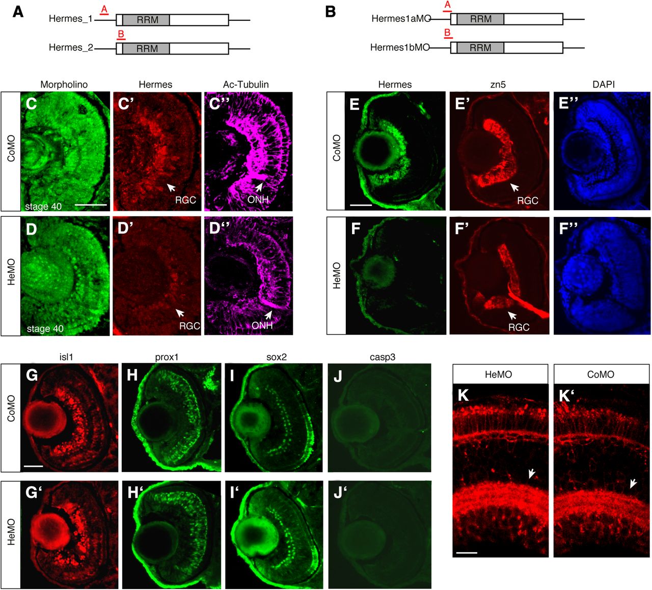 Figure 3. Hermes-depletion does not alter RGC specification and development. A, B, Translational blocking antisense MOs designed for Xenopus (A) and zebrafish (B) were used to knock down Hermes expression in the retina. C, D, Stage 40 retinal sections exhibit strong FITC-tagged MOs (green) signal throughout, indicative of robust intracellular loading following blastomere injections. C′, C″, D′, D″, MO-loaded Xenopus retinas coimmunostained for Hermes (C′, D′) and Ac-tubulin (C″, D″) show a severe loss of Hermes signal in the HeMO-loaded retina (D′) compared to control (CoMO; C′), but normal formation of the RGC layer and ONH (C″, D″). E–F″, Transverse sections of 56 hpf CoMO or HeMO injected zebrafish embryos coimmunostained for Hermes (E, F), zn5 (E′, F′), and DAPI (E″, F″). G–J′, Zebrafish retinal sections (56 hpf) of CoMO- or HeMO-injected embryos stained with antibodies to Isl1 (G, G′), prox1 (H, H′), Sox2 (I, I′), and Caspase-3 (J, J′). K, K′, Retinal sections of atoh7:RFP transgenic CoMO-injected (K) or HeMO-injected (K′) zebrafish embryos showing RGC dendrite sublamination in the IPL at 5 dpf. Scale bars: (in C, E, G) C–J′, 100 μm; (in K) K, K′, 25 μm. |