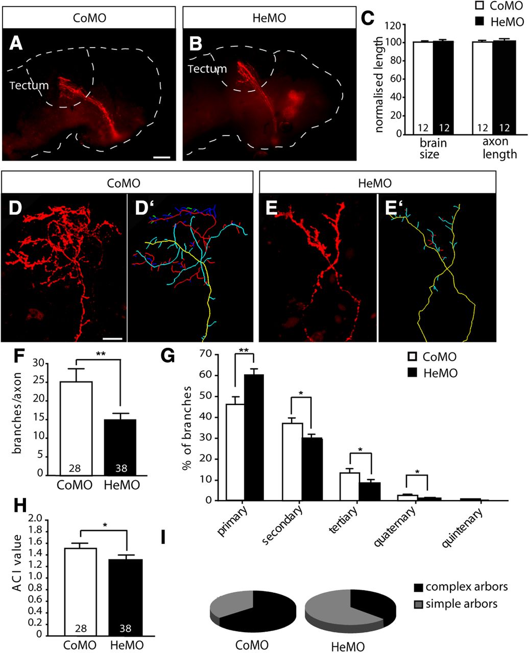 Figure 5. Hermes knockdown inhibits axonal branching in zebrafish. A–B, Embryos were injected with either CoMO or HeMO and fixed at 5 dpf followed by anterograde DiI labeling of RGC axons. Control- (A) and HeMO-injected embryos (A′) at 5 dpf show no difference in long-range axon guidance, brain size, or axon length (B). C–D′, Control- (C) or HeMO-injected embryos (D) were injected with eGFP to label single axons and are shown in whole-mount views of the tectum at 4 dpf, with corresponding tracings of arbor outlines in C′ and D′. E–J, HeMO-injected embryos show a significant reduction in total number of branches per axon (E), percentage of branches at all branch orders (F), ACI index (G), total arbor length (H), arbor area (I) and percentage of complex arbors (J). Simple arbors, ACI < 1.4; complex arbors, ACI ≥ 1.4. Error bars represent SEM. *p < 0.05; **p < 0.01; ***p < 0.001; Mann–Whitney test. The numbers of embryos (B) and axons (E–J) analyzed are indicated on the bars. Scale bars: (in A) A, A′, 50 μm; (in C) C–D′, 20 μm. |