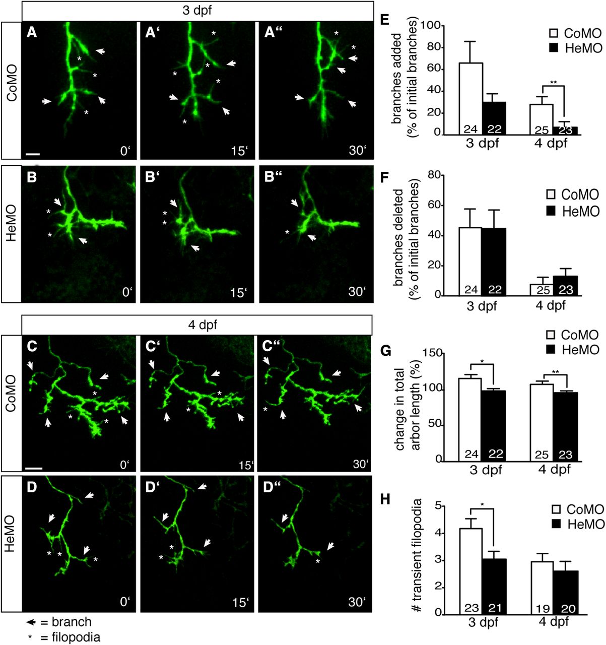 Figure 6. Hermes knockdown alters branch dynamics. A–D″, GFP-labeled retinal axon arbors of HeMO- or CoMO-injected embryos were imaged every 15 min for 30 min at 3 dpf (A–B″) and 4 dpf (C–D″). E–G, HeMO-injected embryos added fewer branches at both 3 and 4 dpf, significantly at 4 dpf (E), with no difference in the percentage of deleted branches (F). Hermes morphants showed a significant decrease in total arbor length at both 3 and 4 dpf (G) and a decrease in transient filopodia at 3 dpf (H) compared to control-injected embryos. Error bars represent SEM. *p < 0.05; **p < 0.01; Mann–Whitney test. The numbers of axons analyzed is indicated on the bars. Scale bars: 10 μm. |