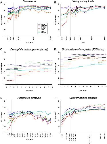 Figure 2. TF and TF family expression throughout embryogenesis based on microarray or RNA-seq data.The gray vertical line in each plot indicates the onset of gastrulation. Table S2 shows the numbers of TFs and members of TF families included in each dataset used for this figure.