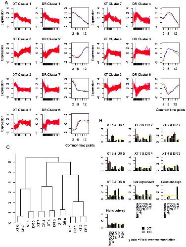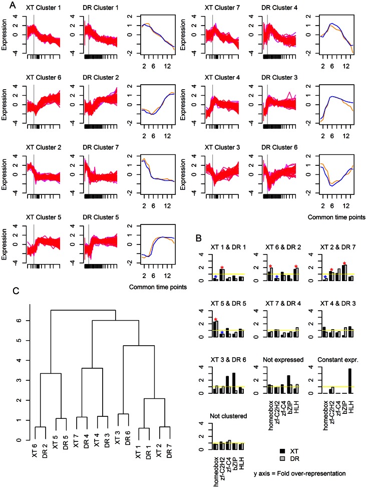 Figure 4. Comparison of TF expression clusters in Xenopus tropicalis (XT) and Danio rerio (DR).(a) The expression profiles of the cluster pairs. The gray vertical line indicates the onset of gastrulation. The plot in the third column shows the values of the centers of the clusters at each of the common time points. Orange is Xenopus tropicalis and blue is Danio rerio. (b) Dendrogram showing hierarchical clustering of the clusters. (c) TF family representation in each cluster. The dark gray represents Xenopus tropicalis and the light gray Danio rerio. Blue stars signify statistically significant over-representation of a TF family in a cluster pair; red stars signify statistically significant under-representation of a TF family in a cluster pair.