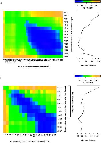 Figure 6. Similarity of TF transcriptomes between species.Heatmaps showing the similarity of the TF transcriptome at all time points for (a) Xenopus tropicalis and Danio rerio and (b) Drosophila melanogaster and Anopheles gambiae. Darker blue/violet shading indicates that the TF trancriptomes for the two species at the given times during development are more similar. The profiles on the right shows the minimum distance between (a) each time piont of Xenopus tropicalis and any time point in Danio rerio and (b) each time point of Drosophila melanogaster and any time point in Anopheles gambiae. In (b), the bracketed time periods for Drosopila are those included in the study by Kalinka et al. (2010) that showed that the time period between 8–10 hours is when the transcriptomes of different Drosophila species are most similar. That time period (indicated by a *) is a local maximum for TF transcriptome similarity between the two insects considered in this study; the 16–18 hour time period for Drosophila melanogaster (indicated by a **) is the time period with the greatest TF transcriptome similarity to Anopheles gambiae.