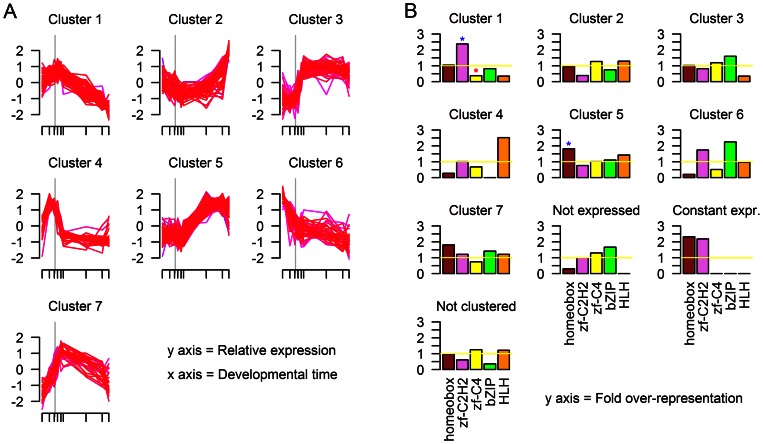 Figure 3. Clustering of transcription factor expression patterns in C. elegans.(a) The expression patterns of members of each of the seven clusters determined by Mfuzz. The gray vertical line indicates the onset of gastrulation. (b) The relative representation of different TF families in each cluster. Blue stars signify statistically significant over-representation of a TF family in a cluster; red stars signify statistically significant under-representation of a TF family in a cluster.