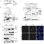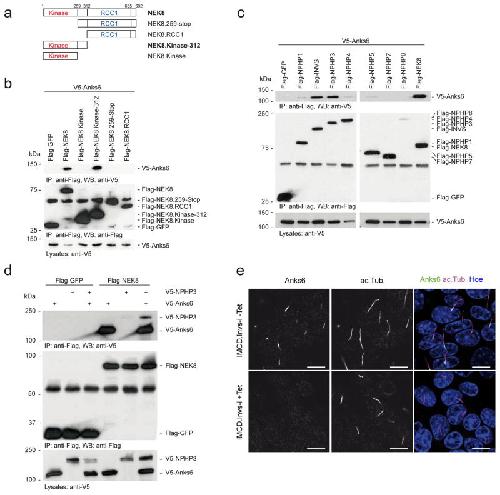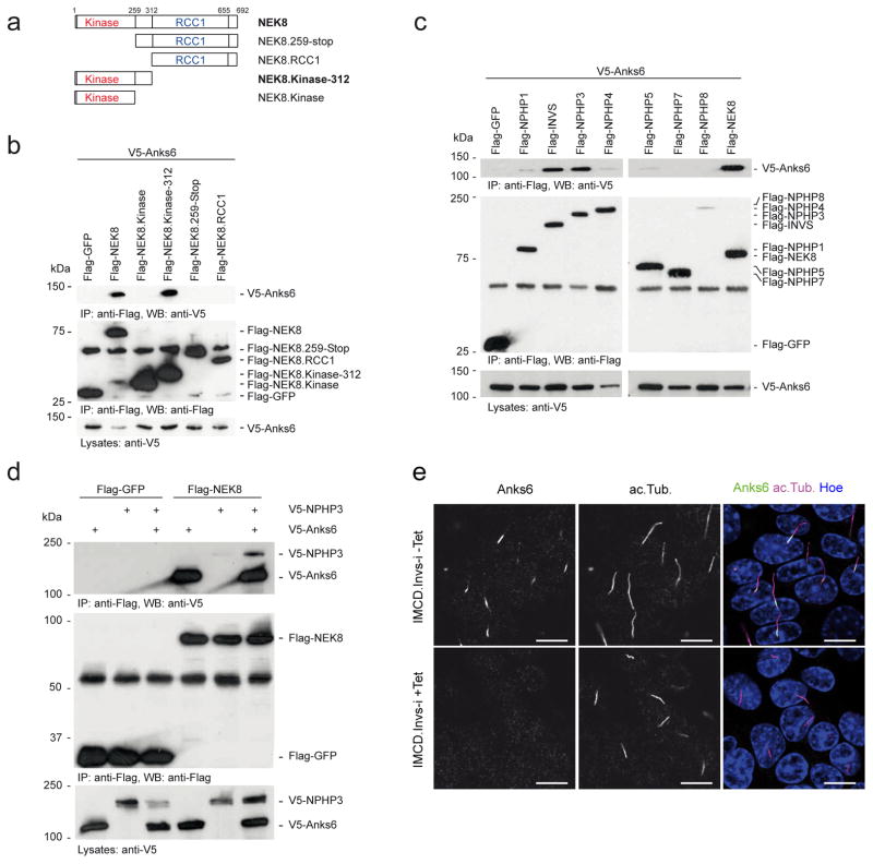Figure 3. ANKS6 interacts with NEK8, INVS and NPHP3(a) Schematic representation of NEK8 truncations used for co-immunoprecipitation (CoIP). NEK8 contains a kinase and a regulator of chromosome condensation (RCC1) domain. (b) V5 tagged full-length rat Anks6 was co-transfected with Flag tagged NEK8 truncations. Anks6 was found in the precipitates of full-length NEK8 and the truncation containing the kinase domain up to a.a. 312 (Kinase-312) after immunoprecipitation with an anti-Flag antibody. (c) Anks6 was found in precipitates of INVS, NPHP3 and NEK8 in CoIPs of V5 tagged Anks6 and Flag tagged NPHP proteins. (d) Flag tagged NEK8 was co-expressed with V5 tagged NPHP3 and Anks6. NPHP3 was detected only in the precipitates in which Anks6 was co-expressed. (e) Confocal images of tetracyclin inducible Invs-knockdown cells (IMCD3) stained for Anks6 and acetylated tubulin (cilia, magenta). Ciliary staining for Anks6 (green) was lost in Invs depleted cells. Hoechst (Hoe) stained nuclei. Scale bars; 10 μm. |