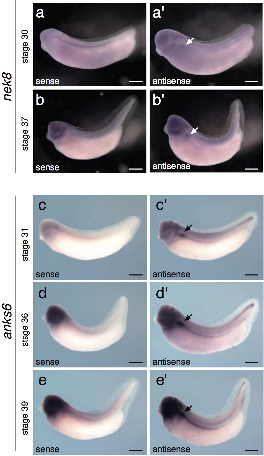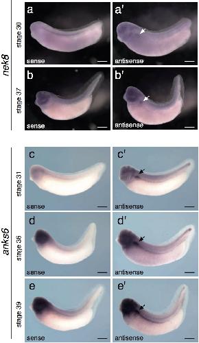 Supplementary Figure 3. Spatial and temporal expression pattern of anks6 and nek8 in Xenopus (a-e) Lateral views of Xenopus embryos after WISH for nek8 and anks6 at indicated at stages. (a-e) Negative controls with the sense probe. (a’-e’) Specific staining by the antisense probe. nek8 and anks6 expression was first detectable at stage 30-31 (arrows). At stage 36 to 39 nek8 and anks6 was expressed in the proximal part of the renal tubules (arrows). Scale bars; 500 μm. |