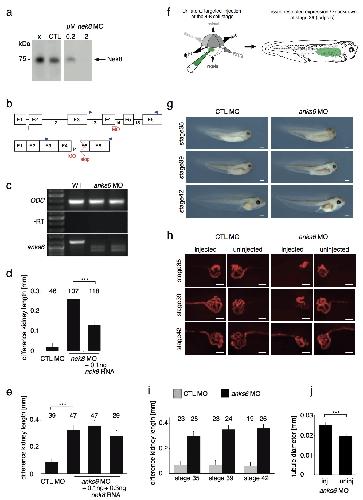 Supplementary Figure 4. Xenopus morpholino efficiency and specificity (a) In vitro translated Nek8 protein is abolished in the presence of 2μM of nek8 MO. (b) Schematic illustration of anks6 splice blocking MO targeting exon4/intron4 boundary. The positions of the primers used for RT-PCR analysis are indicated by blue arrows. Sequencing of RT-PCR products illustrated in (c) revealed that a frameshift was causing a premature stop codon. E, exon; I, intron. (d) Specificity control of nek8 MO. The renal phenotype of nek8 depleted morphants could be rescued by co-injection of nek8 mRNA (*** p<= 0.001); Mann Whitney rank sum test; error bars: SEM. (e) The difference of kidney length caused by anks6 depletion (*** p<= 0.001) could not be rescued by nek8 mRNA; Mann Whitney rank sum test; error bars: SEM. (f) Schematic illustration of unilateral targeted injection of GFP. The fluorescent signal was restricted to one side of the tadpole. (g) The gross morphology of anks6 MO injected embryos was not altered. No developmental delay was observed at any stage. Scale bars; 500 μm. (h) Staining with the pronephric specific antibodies 3G8 and 4A6 was performed on Xenopus embryos at indicated stages. Shortening of the tubules of the injected side was observed and quantified in (i) Scale bars; 200 μm. (j) Measurement of tubule diameter in lectin-stained embryos unilaterally injected with anks6 MO detected an enlargement on the injected side (n=47; *** p<= 0.001). |