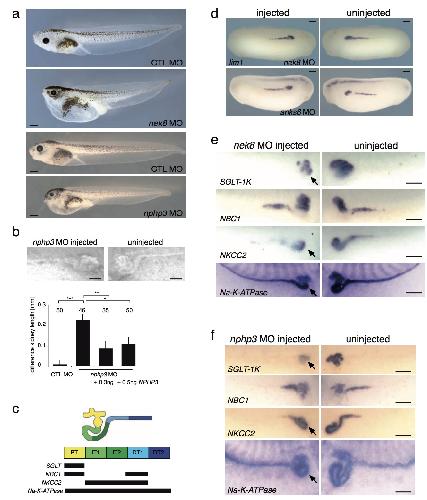 Supplementary Figure 5. Characterization of the pronephric phenotype of nek8 and nphp3 knockdown in Xenopus (a) Bilaterally nek8 and nphp3 MO injected Xenopus embryos developed edema in contrast to control embryos. Scale bars; 500μM. (b) Images of a lectin stained pronephros of nphp3 morphants showed a simplified proximal tubule similar to nek8 and anks6 morphants. Quantification of the nphp3 MO rescue experiment by co-injection of NPHP3 RNA (* p= 0.011; ** p= 0.003; *** p=< 0.001); t-test; error bars: SEM. (c) Schematic illustration of the expression of segment specific pronephros markers. The sodium glucose transporter SGLT-1K is exclusively expressed in the proximal tubule and nephrostomes. The sodium bicarbonate transporter NBC1 is expressed in the proximal tubule and early distal tubule but not in the intermediate tubule. The sodium/potassium co-transporter NKCC2 is specifically expressed in the intermediate segment. The β1 subunit of the Na-K-ATPase is expressed along the entire length of the pronephros. (d) Unilateral injec- tions of nek8 and anks6 MO at the four cell stage were followed by WISH for the transcription factor lim1. No difference in the expression was observed between the injected and the uninjected side of the embryos at stage 28. Scale bars; 200 μM. (e) After unilateral injection of either nek8 (e) or nphp3 MO (f) WISH for different pronephric segment markers was performed. The expression of SGLT-1K, NKCC2 and Na-K-ATPase was reduced on the MO injected sides (arrows). Scale bars; 200 μM. |