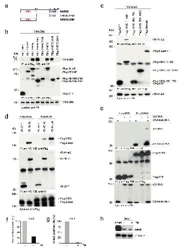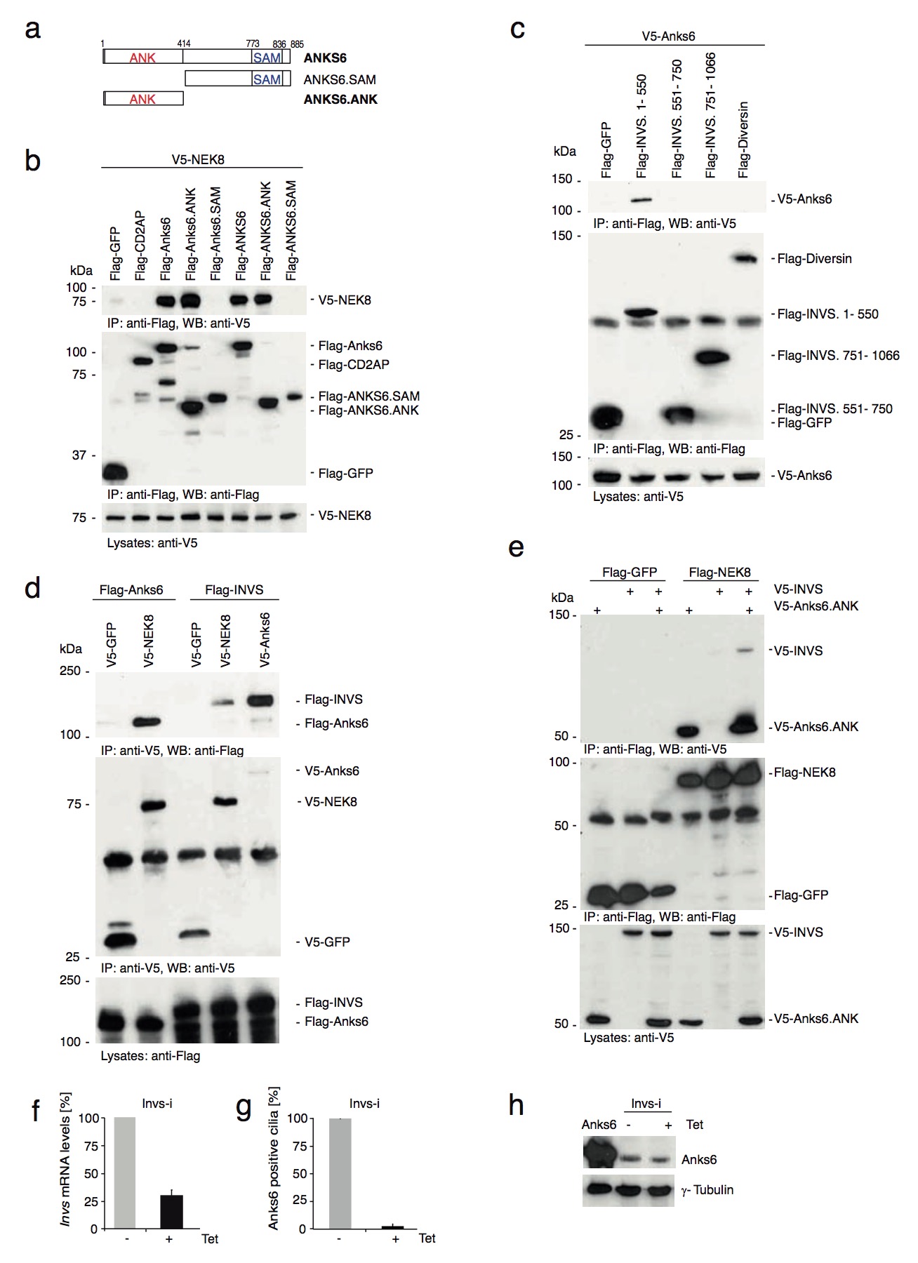 Supplementary Figure8. The ankyrin repeat domain of ANKS6 mediates the interaction with NEK8 (a) Schematic representation of ANKS6 truncations used for CoIP. (b) Flag tagged full-length and truncated forms of rat and human Anks6 were co-transfected with V5 tagged full-length NEK8 in HEK293T cells. After immunoprecipitation with an anti-Flag antibody, NEK8 was present in the precipitates of the full-length and the ankyrin repeat domain of rat and human Anks6 (ANKS6.ANK). It was not detected in the precipitates of GFP, CD2AP (negative controls) and the SAM domain of ANKS6 (ANKS6.SAM). (c) Flag tagged Diversin and Flag tagged truncations of INVS were co-expressed with V5 tagged ANKS6, but ANKS6 co-precipitated only with the ankyrin repeat domain (AA 1-550) of INVS. (d) CoIP of wheat germ lysates. Anks6 and INVS were present in NEK8 precipitates. INVS also interacted directly with Anks6. (e) Flag tagged NEK8 was co-expressed with V5 tagged INVS and the ankyrin domain truncation of Anks6. After immunoprecipitation with an anti-Flag antibody INVS was only present in the NEK8 precipitates when Anks6 was co-expressed. (f) qPCR for Invs mRNA of total RNA extracted from Invs-i cells. The knockdown is inducible by tetracycline and decreases Invs mRNA levels; error bars: standard deviation. (g) Cilia with Anks6 positive staining in Invs-i cells under tetracyclin induced conditions were reduced from 100 to 2.7%, error bars: standard deviation. (h) Western blot of overexpressed Anks6 and Invs-i cell lysates were stained for Anks6. Anks6 protein level was not altered in the Invs knockdown situation (+ Tet). γ-tubulin served as loading control. |