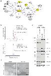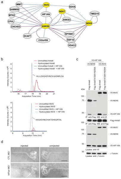 Figure 4. ANKS6 forms a complex with NEK8, INVS, NPHP3 and HIF1AN(a) Protein-protein interaction network, visualized by Cytoscape (cytoscape.org) generated by affinity purification data from TAP tagged (dashed lines) and Flag tagged (solid lines) baits in HEK293T or IMCD3 cells. Proteins that were identified in complex with at least two bait proteins (ANKS6, INVS, NEK8) or in two different experiments (TAP tagged and Flag tagged bait protein) are shown. (b) Extracted ion chromatograms (EIC) of hydroxylated and unhydroxylated peptides. MS analysis of unmodified (blue line) and hydroxylated forms (dashed blue line) of the rat Anks6 peptide illustrate the intensity of hydroxylation of Anks6 at Asn-129 (upper EIC) and of the human INVS peptide at Asn-75 (lower EIC). (c) Co-IP of V5 tagged INVS, NEK8 and HIF1AN with rat Anks6 and Anks6 mutated at the hydroxylation sites N129 and N209. The mutated Anks6 precipitated less NEK8, but had no effect on binding to INVS.(d) Unilaterally hif1an MO injected Xenopus embryos stained with fluorescein conjugated lectin to visualize the pronephric tubules. hif1an MO injected embryos showed a strong simplification of the proximal tubules in contrast to the uninjected pronephros (arrow). Scale bars; 200 μM. |