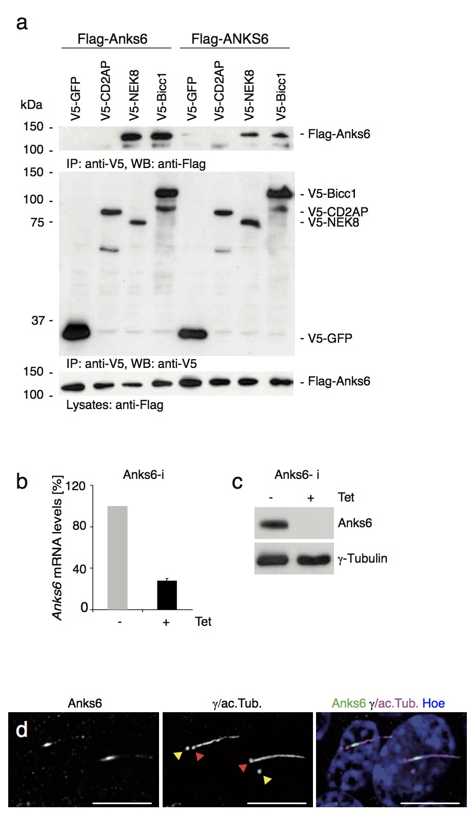 Supplementary Figure 1. Binding of NEK8 to human and rat orthologues of Anks6 (a) Flag tagged full-length rat and human Anks6 were co-transfected with V5 tagged full-length NEK8 in HEK293T cells. After immunoprecipitation with an anti-V5 antibody, NEK8 was present in the precipitates of rat and human Anks6 and mouse Bicc1 which served as a positive control. (b) Quantitative real time polymerase chain reaction (qPCR) for Anks6 mRNA of total RNA extracted from Anks6-i cells. The knockdown was inducible by tetracycline and decreased Anks6 mRNA levels; error bars: standard deviation. (c) Western blot of Anks6-i cell lysates. Anks6 protein was not detected in knockdown cells (+Tet). γ-tubulin served as loading control. (d) Immunostaining of IMCD3 cells for Anks6 (green) and γ-tubulin/acetylated tubulin (magenta) (basal bodies, red arrowheads; daughter centriole yellow arrowheads) confirmed localization of Anks6 to the proximal cilium. Hoechst (Hoe, blue) was used for nuclear staining. Scale bars; 10 μm. |