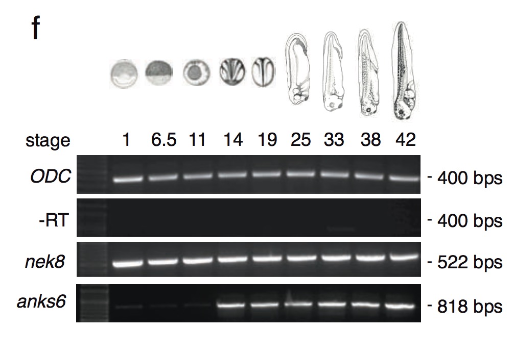 Supplementary Figure 3. Spatial and temporal expression pattern of anks6 and nek8 in Xenopus [continued] (f) Lysates from embryos of indicated stages were used for RT-PCR. Primer specific for the house keeping gene ODC (control), nek8 and anks6 were used. The amplification of the isolated RNA (-RT) with ODC primers served as negative control. nek8 transcripts were constitutively present between stage 1 and stage 42 whereas anks6 was first expressed at stage 14. |