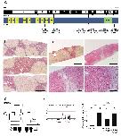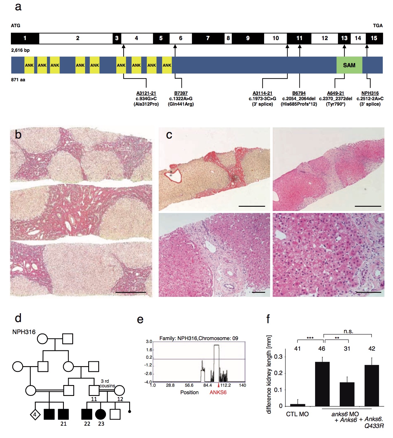 Supplementary Figure 6. Human mutations in ANKS6 (a) Identification of recessive mutations in ANKS6 in six families with nephronophthisis. Exon structure of human ANKS6 cDNA (without UTR). Positions of start codon (ATG) and of stop codon (TGA) are indicated. Domain structure of the ANKS6 protein, consisting of nine ankyrin repeat domains (ANK), and a sterile alpha motif domain (SAM) at the C-terminal end. For the mutations detected arrows indicate positions in relation to exons and protein domains. (b) Liver biopsy specimen from Patient B6794 showing macronodular cirrhosis. In the connective tissue, a severe ductular reac- tion is seen. The arteries are apparently unaccompanied by interlobular bile ducts (Picro-Sirius stain highlighting colla- gen); scale bar, 0.5 mm. (c) Needle core biopsy of liver from patient A3114-21 showing bland portal fibrosis with portal to portal bridging fibrosis. The central vein is unremarkable and there is no significant hepatitis. Van Giesen stain left (fibrosis highlighted in red) and haematoxilin/eosin (HE) stain right of upper panels; scale bars, 0.5 mm. Lower panels show higher magnification of the HE stained tissue; scale bars, 0.1 mm. (d) Pedigree of a consanguineous Turkish family (NPH316) with nephronophthisis and aortic stenosis. Linkage analysis revealed a unique homozygous region of 8Mb spanning the ANKS6 locus on chromosome 9. We subsequently identified a homozygous mutation of ANKS6 affecting the consensus acceptor splice site in intron 14 that segregates with the disease. (e) Values of non-parametric the logarithm of odds (LOD) scores across chromosome 9 of family NPH316: X-axis gives Affymetric 250k SNP positions (Mb) and Y-axis gives the (LOD) score values. The maximal LOD score of 2,407 was obtained for the homo- zygous region spanning the ANKS6 locus. (f) Quantification of Xenopus rescue experiments of anks6 MO with the Q433R mutated rat Anks6 RNA corresponding to the patient mutation Q441R (B7397). Mutant Anks6 RNA could not ameliorate the renal anks6 MO phenotype. (*** p<= 0.001; ** p= 0.006; n.s. p= 0.987); t-test; error bars: SEM. |