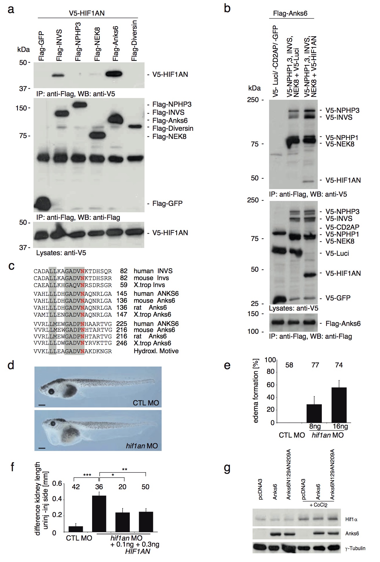 Supplementary Figure 10. The function of HIF1AN (a) CoIP of V5 tagged HIF1AN. HIF1AN was found in the precipitates of INVS, and Anks6 but not Diversin. (b) CoIP experiments of Flag tagged rat Anks6 and V5 tagged NPHP1, INVS, NPHP3 and HIF1AN. After immunoprecipitation with an anti-Flag antibody NPHP3 and INVS protein levels were increased in Anks6 precipitates when HIF1AN was co-expressed. (c) Alignment of HIF1AN consensus sequence from INVS and ANKS6 orthologues of indicated species. Grey underlayed residues represent conserved amino acids of the recognition motif with essential residues in red. The hydroxylated asparagine (N) is shown in bold. The numbers on the right indicate the position of the C-terminal amino acid depicted. (d) Bilaterally hif1an MO injected Xenopus embryos developed edema in contrast to the control embryos. Scale bars; 500μM. (e) Quantification of edema formation in percentage. (f) Quantification of hif1an MO rescue experi- ments. The difference of the kidney length [mm] from the uninjected to the injected side could be rescued by co-injection of HIF1AN RNA (* p= 0.005; ** p= 0.002; *** p=< 0.001). t-test; error bars: SEM. (g) After transient transfection HEK293T cells were treated with CoCl2 for 8 hours. The lysates were prepared and analyzed for Hif1α levels. |