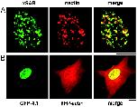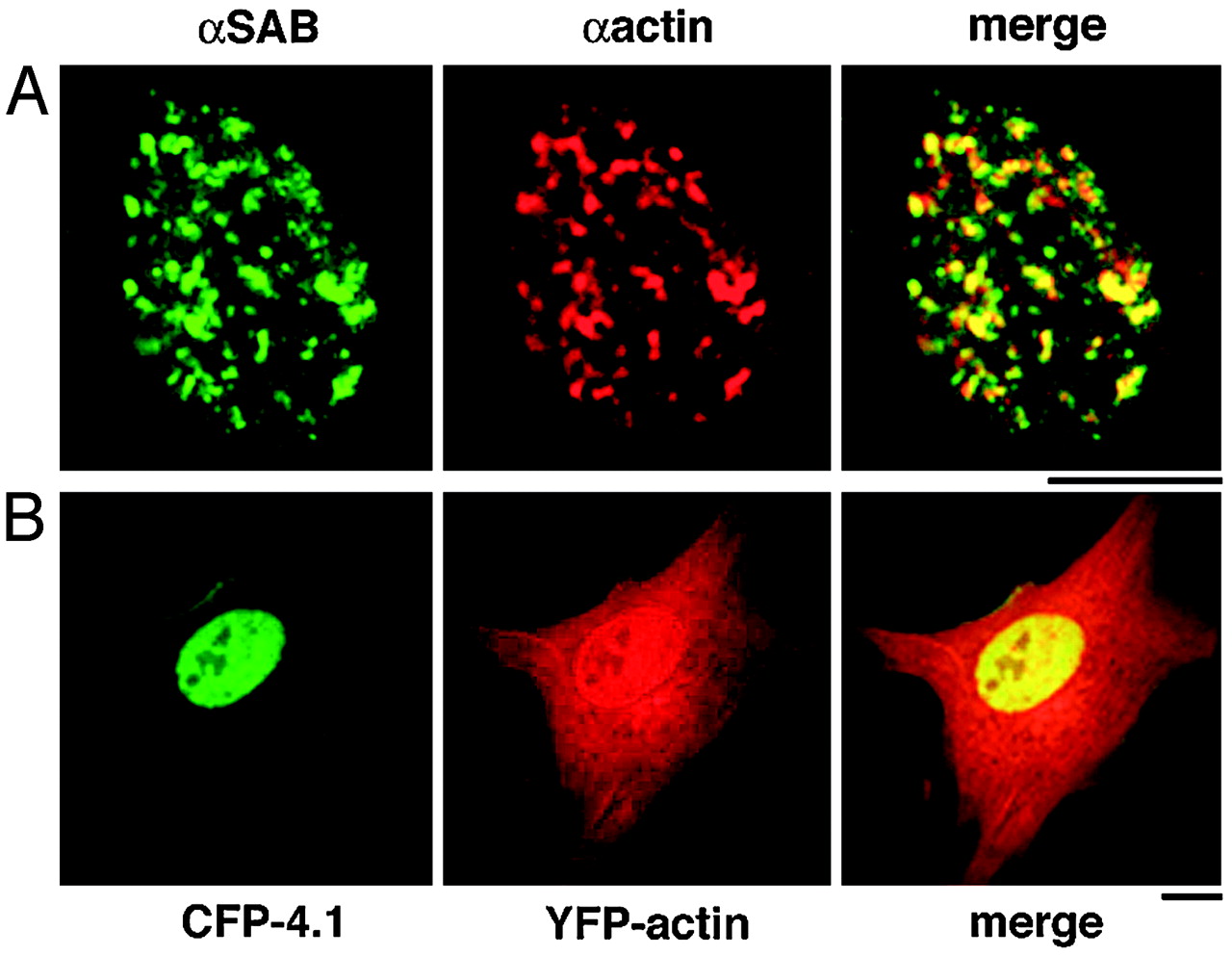 Fig. 1. Colocalization of nuclear actin and 4.1 in human diploid fibroblasts. (A) Double-label immunofluorescence of 4.1 SABD epitopes (green) and actin (red) in WI38 cells extracted in situ to prepare nuclear matrix. The merged image shows a high degree of coincidence (yellow). (B) Transient cotransfection of WI38 cells with YFP-actin (red) and CFP-80kD4.1R (green). Cells were imaged 4â72 h posttransfection. The 24-h image presented shows expression of YFP-actin in both cytoplasm and nucleus, whereas CFP-4.1 is exclusively nuclear, generating coincident nuclear signals (yellow). (Bar, 10 μm.)