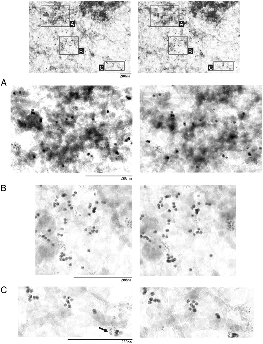 Fig. 2. Immunolocalization of nuclear actin and 4.1 SABD epitopes by double-label immuno-EM of WI38 human fibroblasts. In detergent-extracted cell whole mounts, actin epitopes (10-nm beads) and 4.1 SABD epitopes (5-nm beads) decorated fibrous structures near dense structures in nuclear matrix. At the top is a stereo-pair image of a nuclear matrix region with boxes A–C indicating areas presented as stereo pairs at higher magnification in A–C, respectively. The arrow in C points to intermingled 5- and 10-nm beads.
