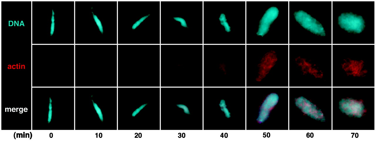 Fig. 3. Acquisition of actin during nuclear assembly in vitro. Fluorescent actin (red) was imaged as nuclei assembled in Xenopus egg extract after the addition of demembranated sperm (DNA, blue) in a representative experiment (n = 4). Diffuse actin was detected in assembling pronuclei only after 30 min. As mature nuclei assembled (50â70 min), an intranuclear actin network-like pattern became apparent.