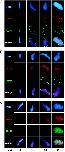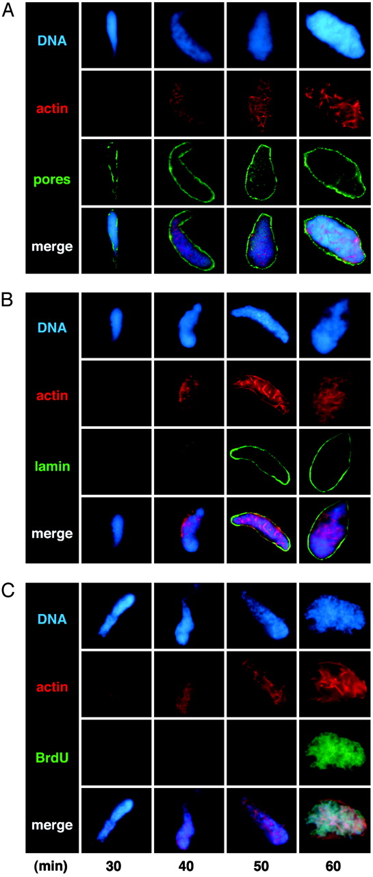 Fig. 4. Acquisition of nuclear actin relative to nuclear pores, lamina formation, and DNA synthesis during nuclear assembly in vitro. Nuclei from Xenopus egg extract reactions spiked with fluorescent actin (red) were isolated at the times indicated, fixed, and probed with mAb414 against nuclear pore proteins (A, green) or antibody L046F7 against lamin (B, green). DNA synthesis was detected with anti-BrdUrd (C, green). Controls without BrdUrd had no detectable green signals. In merged images of mature nuclei, BrdUrd signals coincide with DNA (blue) as expected (aqua), and actin appears noncoincident. Diffuse actin and irregularly distributed pores are detected at 30 min, lamin epitopes at 40 min, and BrdUrd at 50 min. Assembly times vary with extract, but the relative sequence of actin acquisition, pore assembly, lamina formation, and DNA synthesis was maintained in three independent experiments.