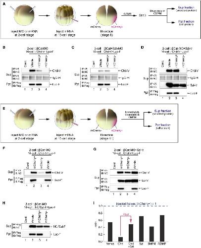 Figure 7. Size-Dependent Control of Chordin Stability. (A) Schematic of reconstitution experiments. The dorsal axis was rescued by a single-blastomere injection of chordin (V5-tagged; 12.5 pg) in the β-catenin-depleted embryo. As a tracer, mcherry (200 pg) was coinjcted for marking the injected site. (BâD) Effect of bisection on the levels of intact Chordin protein. Lanes 1 show uninjected whole embryos. Lanes 2 show whole embryos with mRNA injection. Lanes 3 show injected halves (mCherry+). Lanes 4 show uninjected halves (mCherryâ). IgG-H is the loading control for interexperimental comparison for (B)through (D). In (B), the amount of intact Chordin (top) was decreased in the dorsal halves as compared to that in the same number of the whole embryos. This contrasted the largely constant amounts of control luciferase (bottom; 150 pg luciferase mRNA injection). As shown in (C), when Sizzled was depleted in addition, the amounts of intact Chordin with (lane 3) or without (lane 2) bisection were comparable and low. In the Sizzled-overexpressed conditions in (D), the amounts of intact Chordin with (lane 3) or without (lane 2) bisection were comparable and high. (EâI) Analysis of long-range protein distribution at the early gastrula stage. (E) Schematic of comparison of protein contents in âinjectedâ (mCherry+) and âuninjectedâ (mCherryâ) halves of the stage 11 embryo. In (F), epitope-tagged Chordin was predominantly detected in the âinjectedâ halves (lane 2). In (G), when Sizzled was overexpressed, epitope-tagged Chordin was detected also in the âuninjectedâ halves. In (H), Sizzled (12.5 pg), expressed on one side, was detected on the other side. (I) shows ratios of protein levels detected in the âuninjectedâ halves (the level in the âinjectedâ halves is defined as 1). See also Figure S7. |