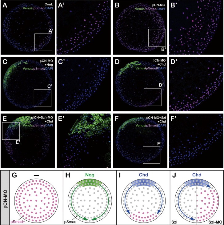 Figure S2. Distinct Long-Range Effects of Chordin and Noggin on pSmad1 Accumulation, Related to Figure 1 (A-F) Immunostaining of phospho-Smad 1 (pSmad1) in the midgastrula embryo. Cryostat sections across the dorsal-to-ventral marginal zone were made parallel to the plane of the blastopore. (A') through (F') show high-magnification images of the insets. (A) and (A') show the control embryo. Strong pSmad accumulation was preferentially seen in the ventral-most region. (B) and (B') show the β-CN-MO embryo. Strong pSmad accumulation was observed throughout the embryo. (C) and (C') show β-CN-MO embryo with single-blastomere injection of noggin (25 pg: venus expression as tracer) at the 8-cell stage. No substantial pSmad accumulation was seen on either the injection or noninjection side, indicating that the effect of noggin spread to the opposite side. (D) and (D') show β-CN-MO embryo with single-blastomere injection of chordin (25 pg: venus expression as tracer) at the 8-cell stage. Substantial pSmad accumulation was observed on the side opposite to the injection region, indicating that the influence of chordin was distance-sensitive. (E) and (E') show β-CN-MO + sizzled-MO embryo with single-blastomere injection of chordin. The area of pSmad accumulation expanded toward the chordin-injection domain. (F) and (F') show β-CN-MO embryo with single-blastomere injection of chordin. In this case, sizzled mRNA (400 pg) was coinjected with β-CN-MO at the 2-cell stage. No substantial pSmad accumulation was seen even on the noninjection side, reminiscent of noggin injection in (C). (G-J) Schematic summary of the differential effects of noggin and chordin in the reconstitution assay. |