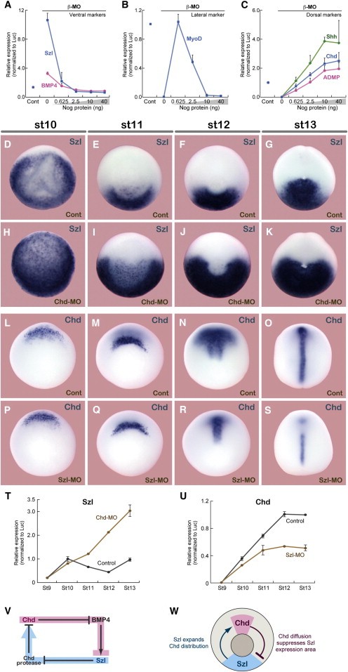 Figure 3. Long-Range Feedback for Expression of chordin and sizzled (A-C) qPCR analysis of transcriptional control for sizzled and bmp4 (A, ventral), myoD (B, lateral), and chordin, admp, and shh (C, dorsal) in the β-catenin-MO-injected embryo at stage 12 (n = 6; three experiments). The values in qPCR (per embryo) were normalized with the internal control (luciferase mRNA) included at the reaction (see Experimental Procedures). The expression levels of the wild-type embryo (Cont; no MO injection) was defined as 1. Increasing amounts of Noggin were injected into the blastocoel of the late blastula as in Figure 2A. Bars represent SD. (D-K) Expression of sizzled in embryos at stages 10 (D and H), 11 (E and I), 12 (F and J), and 13 (G and K). (D) through (G) show control embryos, and (H) through (K) show chordin-MO-injected embryos. (L-S) Expression of chordin in embryos at stages 10 (L and P), 11 (M and Q), 12 (N and R), and 13 (O and S). (L) through (O) show control embryos, and (P) through (S) show sizzled-MO-injected embryos. (T and U) Quantification of expression levels of sizzled (T) and chordin (U) by qPCR (n = 8; three experiments). Bars represent SD. (V) Schematic of the feedback loop involving Chordin, BMP, Sizzled, and Chordin proteinases. (W) Simplified view of the axis-wide long-range feedback by Chordin and Sizzled. |