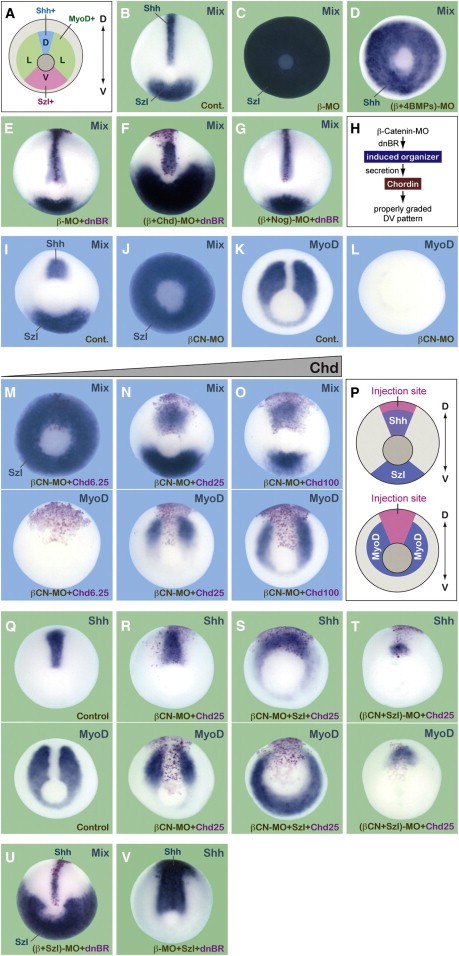 Figure 1. Graded DV Patterning by the Organizer Depends on Chordin (A) Schematic of DV pattern in the control (Cont.) stage 12.5 embryo. D, dorsal; L, lateral; V, ventral. (B) Whole-mount in situ hybridization with shh (dorsal axial) and sizzled (Szl) (ventral) probes (Mix probes, hereinafter). (C) β-catenin-MO-injected embryo with radial expression of sizzled (100%, n = 20). (D) Radial shh expression in the embryo injected with β-catenin-MO and MOs against four major bmp genes: bmp4, admp, bmp2, and bmp7 (100%, n = 11). (E) Single-blastomere injection of dnBR (shown by the LacZ tracer in red; 200 pg) rescued the DV pattern in the β-catenin-MO-injected embryo (100%, n = 13). (F) Single-blastomere injection of dnBR in the embryo injected with β-catenin- and chordin-MOs. Dorsal expansion of sizzled expression was seen. Compare with (E); 100%, n = 15. (G) Single-blastomere injection of dnBR in the embryo injected with β-catenin- and noggin-MOs. No sizzled expansion (87.5%, n = 16). (H) Summary of (E)â(G). (IâT) Reconstitution experiments using the triple-knockdown embryo with MOs for β-catenin, chordin (Chd), and noggin. (I) through (L) show marker expression in the triple-knockdown embryo at stage 12 (J) sizzled and (L) myoD; (I) and (K) show controls. (MâO) Single-blastomere injection of chordin (the LacZ tracer in red) rescued the DV pattern in the triple-knockdown embryo; 100%, n = 12, for (N) and 85.7%, n = 14, for (O), judged by mixed probes. In (M), at a smaller dosage (6.25 pg), no dorsal-lateral region was observed. (P) Schematic of results in (M) through (O). (Q) through (T) show the effects of overexpression (S) and depletion (T) of sizzled on DV markers in the triple-knockdown embryo rescued by chordin (R) (25 pg); control is shown in (Q). (S) Substantial expansion of shh and myoD (86.7%, n = 15 and 100%, n = 16) by sizzled mRNA injection at the two-cell stage (400 pg). (T) Substantial reduction of shh and myoD (100%, n = 17 and n = 16) by sizzled-MO injection at the two-cell stage. (U and V) Effects of loss (U) and gain (V) of Sizzledâs function on the DV pattern. (U) shows substantial expansion of sizzled (100%, n = 20), and (V) shows substantial expansion of shh (87%, n = 23). See also Figures S1 and S2. |
