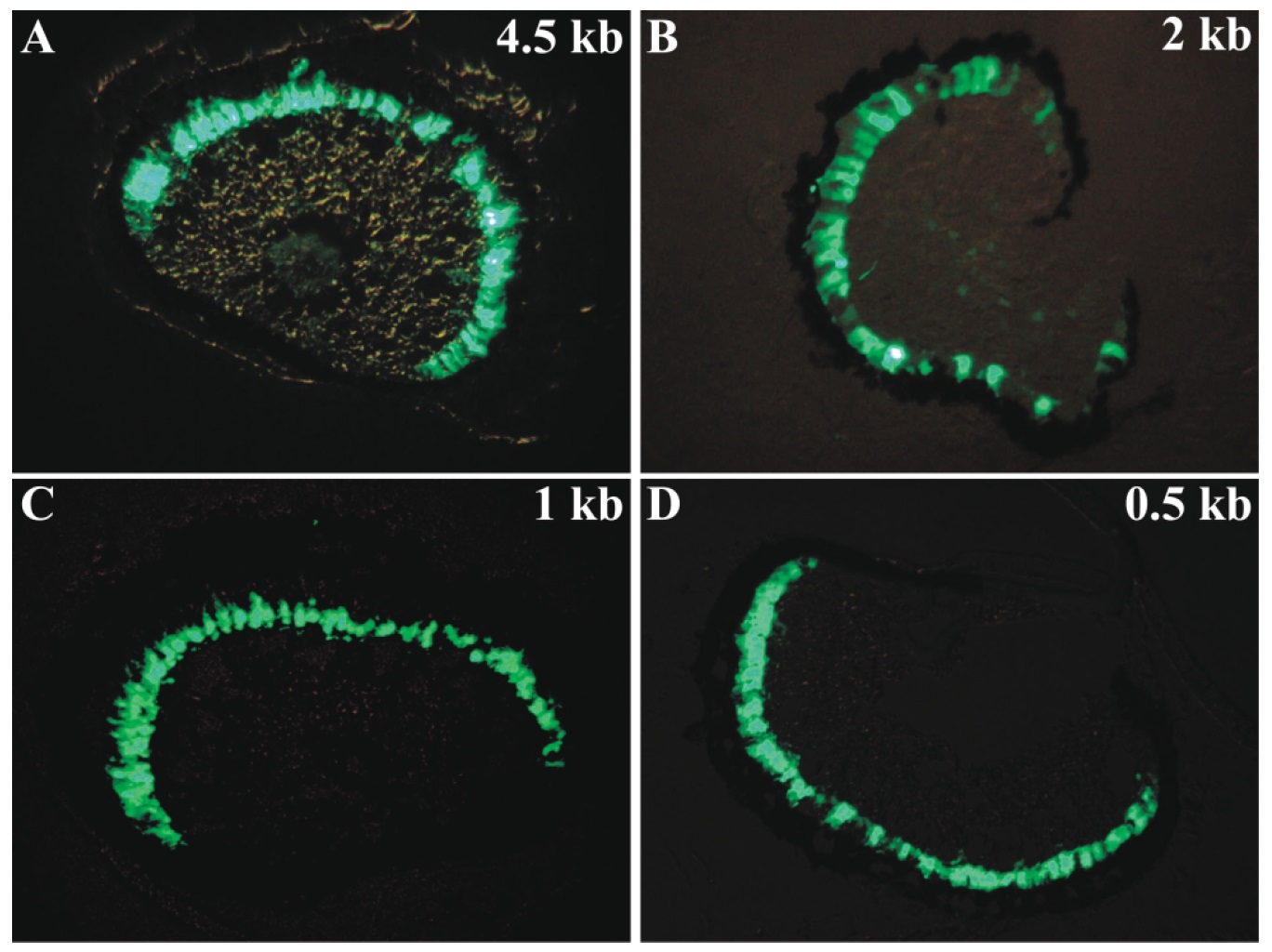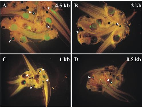 Fig. 4. Fugu rhodopsin promoters effectively target EGFP expression to the eye of transgenic tadpoles. Transgenic tadpoles bearing 4.5, 2, 1, and 0.5 kb Fugu
