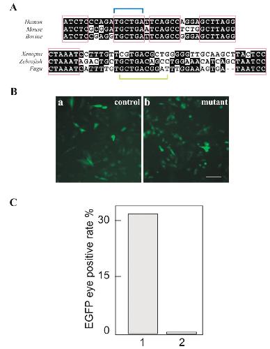 500 bp Fugu rhodopsin promoters were examined for EGFP expression in eyes using a fluorescent microscope. The eye positive rates of wild type (lane 1) and