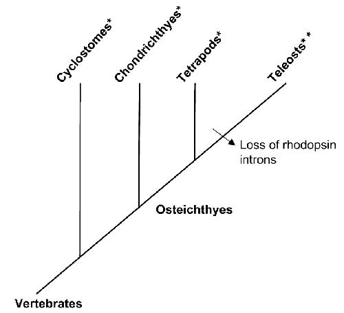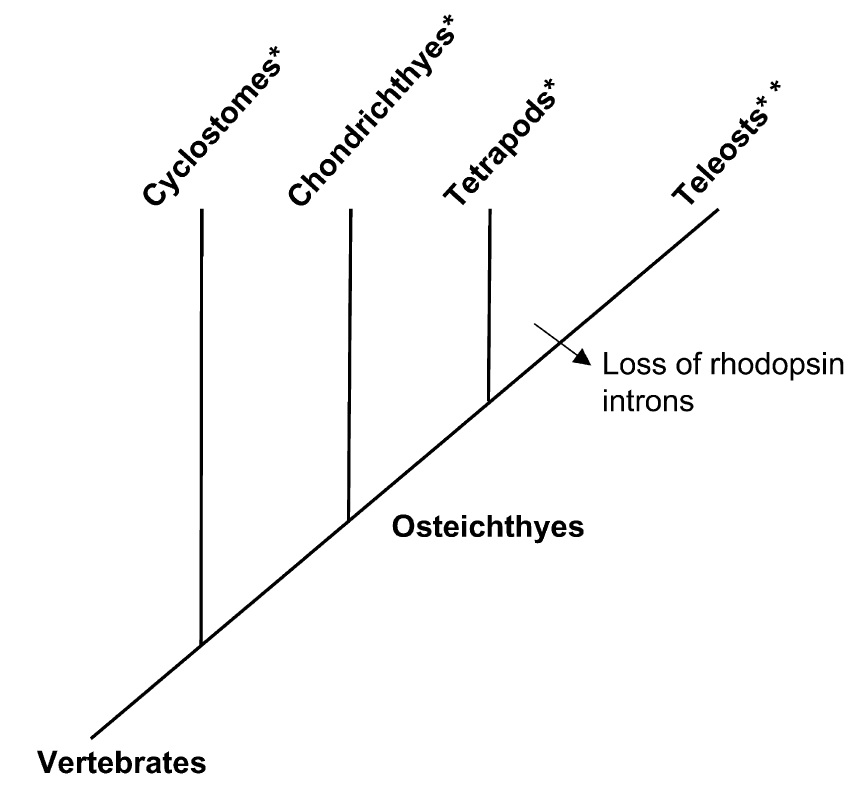 intron-containing rhodopsin gene, **denotes a lineage with an intronless
