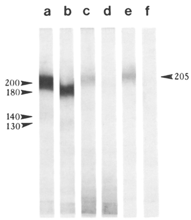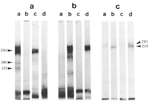 mAb 9-OE bound to the 205-kD N-CAM subset. In the N-CAM-depleted preparations (lanes a and c), mAb 9-OE continued to bind,