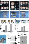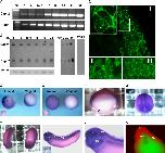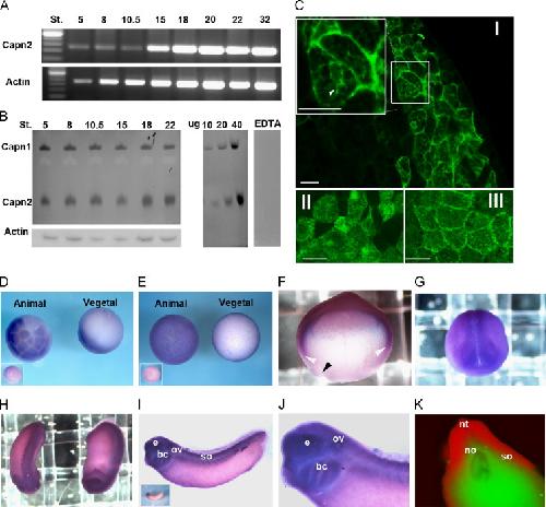 Fig. 1. Calpain2 temporal and spatial expression patterns during Xenopus development. (A) RT-PCR was performed using specific primers for Calpain2 at different stages of development. Actin was used as a loading control. (B) Casein zymography analysis was performed as described under Materials and Methods and shows the activity of Calpain1 (upper band) and Calpain2 (lower band) at different stages of development (left top gel). Western blot of actin was used as a loading control (left bottom gel). Various amounts (10�40 �g) of whole-embryo lysates were loaded on to the gel to assess the method sensitivity (middle gel). As a negative control, a gel loaded with 20 �g of lysate was incubated in a noncalcium proteolysis buffer containing 1 mM EDTA (right gel). (C) HA-Calpain2 localisation. (I) Cross-section through the dorsal mesoderm of a stage 12 embryo ectopically expressing HA-Calpain2 and stained with an anti-HA antibody. A high-magnification view of the boxed region is shown in the inset. The white arrow indicates the presumptive Golgi�ER complex. (II) HA-Calpain2 localisation in ectodermal cells of a stage 9 embryo. (III) HA-Calpain2 localisation in neural ectodermal cells of a stage 13 embryo. Scale bars=20 μΜ. (D�K) Expression pattern of Calpain2 in Xenopus by WISH. (D) Animal (left) and vegetal (right) view of a stage 5 embryo. Control hybridisation with the sense probe is shown in the inset. (E) Animal (left) and vegetal (right) view of a stage 9 embryo. Control hybridisation with the sense probe is shown in the inset. (F) Sagittal section of a stage 10.5 embryo, apical to the top, dorsal to the left. Black arrow: blastopore lip. White arrows: Mesodermal staining. (G) Dorsal view of a stage 17 embryo, anterior to the bottom. (H) Dorsal (left) and lateral (right) view of a stage 22 embryo, anterior to the bottom. (I�K) Stage 30 embryos. (I) Lateral view, anterior to the left, dorsal to the top. Control hybridisation with the sense probe is shown in the inset. (J) High magnification view of anterior region. (K) Cross-section view, dorsal to the top, of a WISH-stained tailbud embryo visualised by fluorescent microscopy (WISH-staining in red; background fluorescence in green). Abbreviations: e, eye; ov, optic vescicle; bc, branchial arches; so, somites; no, notochord; nt, neural tube. |