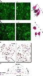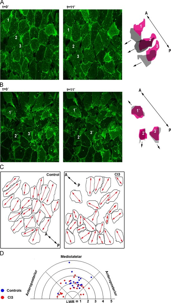 Fig. 7. Inhibition of Calpains affects the morphology and motility of mesodermal cells. Still frames from time-lapse movies of control (A) and CI3-treated (B) DMZ explants. mGFP was used as a lineage tracer. Time (t) in minutes is shown at the top left of each frame. Outlines of randomly chosen cells (1, 2, 3 in control explants and 1′, 2′, 3′ in CI3-treated explants) are shown to the right of each panel. They were drawn from the first (pink) and last (grey) frames of the movie and superimposed. Black arrows indicate the direction of migration for each cell. The black double arrow head represents the orientation of the antero-posterior (AP) axis. Cells in CI3-treated explant show alteration in morphology, orientation and motility. (C) Outlines of cells from an intermediate frame were traced and their long axes indicated with red arrows. The black double arrow head represents the orientation of the AP axis. In control explants, the cells are polarised along the medio-lateral axis. In CI3-treated explants, some cells show identical polarisation axis but the overall tissue polarity is disrupted. (D) Circular diagram of LWR versus the angle of the long axis of each of cells in A and B. Controls cells are clustered mediolaterally. Cells in CI3 treated explants are distributed randomly. Circular diagram prepared using Oriana 4.01 software. |