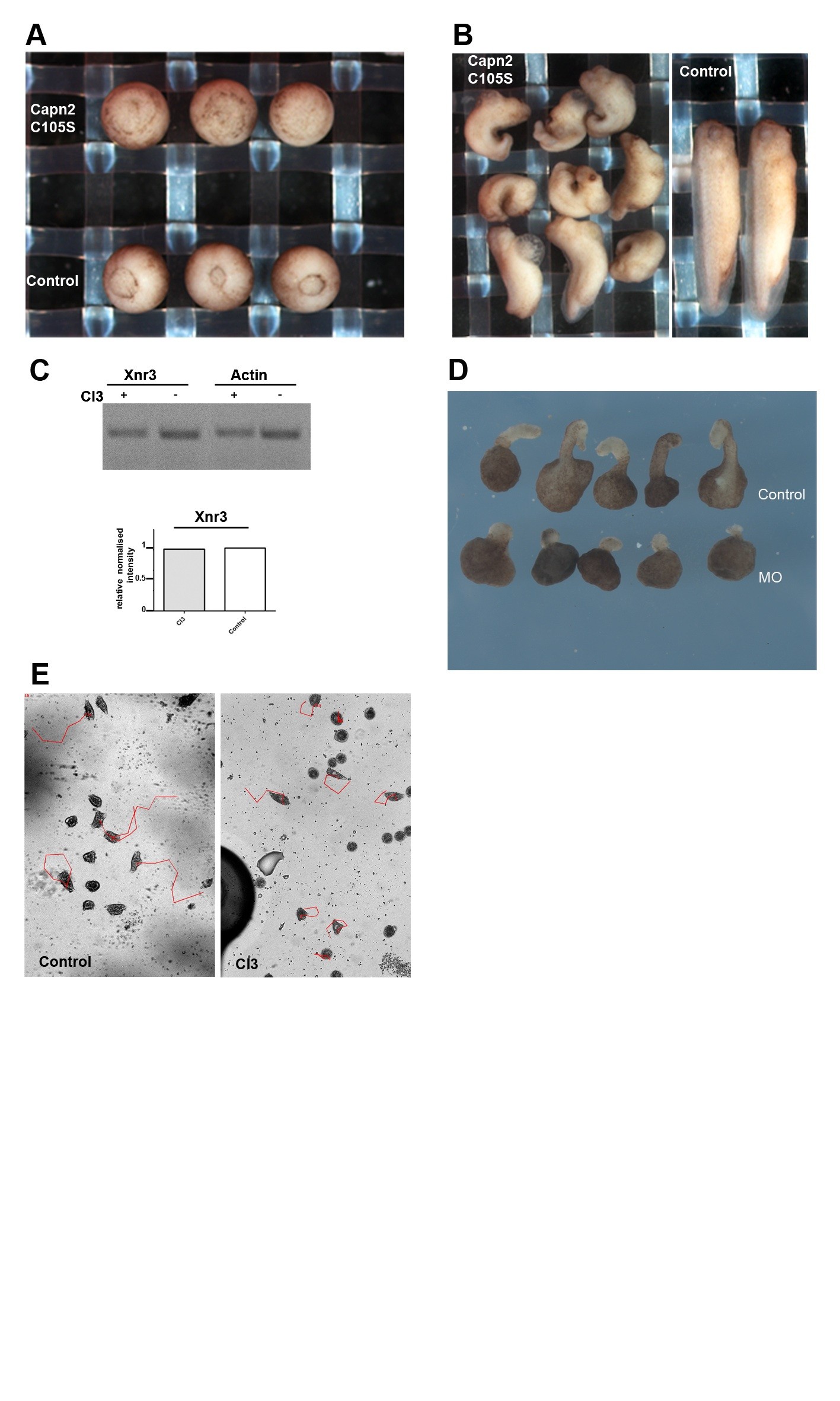 Suppl. Figure1. Inhibition of Calpain2 delays blastopore closure, blocks mesoderm convergent extension and modulates mesoderm migration, without affecting the canonical Wnt pathway. (A-B) Embryos were injected at 2 blastomeres at 2-cell stage with 1ng Capn2C105S. (A) Embryos injected with Capn2C105S show a marked delay in blastopore closure at stage 12 (top embryos) compared to controls (bottom embryos). (B) Tailbuds of embryos injected with Capn2C105S (left image) are shorter, dorsally-bent and lacking head structures. Some severe cases are spina bifida. Controls are shown to the right. (C) RT-PCR analysis shows that Xnr3 expression is not affected by CI3 treatment in stage 11 embryos. Xnr3 expression levels have been calculated using ImageJ and normalised against the loading control. (D) Injection of 70ng of Capn2 MO impairs the activin-induced elongation of animal caps explants. (E) Cell traces from Control and CI3-treated mesodermal cells derived from activin-treated dissociated caps and plated on fibronectin-coated coverslip. |