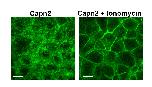 Suppl. Figure3. Calpain 2 localisation is dependent on intracellular Ca2+ concentration. Animal cap cells of stage 9 embryos injected with 400pg HA-Capn2. In embryos treated for 40 min with 10μΜ Ionomycin, Capn2 localises at the membrane whereas it is diffused in the cytoplasm in untreated embryos. Scale bar = 20μM. |