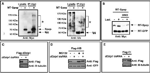Figure 6. Dzip1 prevents ubiquitin/proteasome-dependent degradation of Spop/HIB. (A) Spop is ubiquitinated in vivo. MT-Spop was injected into Xenopus embryos. Spop protein was purified by immunoprecipitation using an anti-myc antibody. Lysates and immunoprecipitates from injected and uninjected embryos were subjected to Western blot with the anti-myc antibody (left panel) and anti-ubiquitin antibody (right panel). The unmodified MT-Spop band migrated to 68 kDa. A smear of high molecular weight proteins (*), migrating slower than unmodified MT- Spop, could be detected in both myc and ubiquitin Westerns. (B) MT-Spop was injected into control or embryos that had received a prior injection of DMO. Animal caps were dissected at stage 9. Subsequently, caps were cultured in media with or without 2μg of lactacystin. Animal caps were harvested at stage 15 and subjected to Western blot to detect the levels of Spop. (C) Western blot results showing severe reduction of Flag-dDzip1 by dDzip1 dsRNA in S2 cells. �- tubulin serves as a loading control. (D) Dzip1 knockdown promoted proteasome-dependent degradation of HIB in S2 cells. S2 cells were cotransfected with Flag-HIB and GFP constructs and treated with dDzip1 dsRNA and/or MG132. Cell extracts were subjected to Western blot with the anti-Flag antibody to detect the levels of HIB. GFP serves as transfection and loading control. (E) Dzip1 knockdown promotes Ci stability in S2 cells. S2 cells were transfected with Flag-Ci and treated with dDzip1 dsRNA. Western blots were carried out with the cell lysates to determine the levels of Ci. Tubulin serves as a loading control.