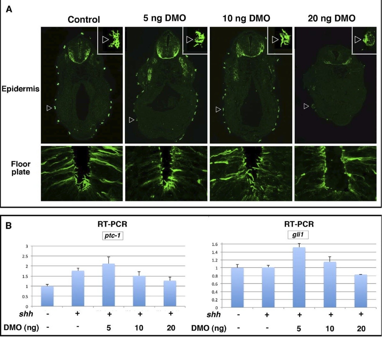 Figure 1. Sensitization of Xenopus animal caps to Shh by partial knockdown of Dzip1. (A) Immunofluorescence showing primary cilia in the floor plate (bottom panel) and epidermis motile cilia (top panel, pointed by arrowheads) in control (left column) and embryos injected with 5, 10 or 20 ng of DMOs (from left to right). (B) Real-time RT-PCR showing the expression of ptc1 and gli1 in animal caps from controls and embryos injected with shh mRNA (500pg) alone or in combination with 5, 10, or 20 ng of DMOs. All samples were normalized to odc levels.