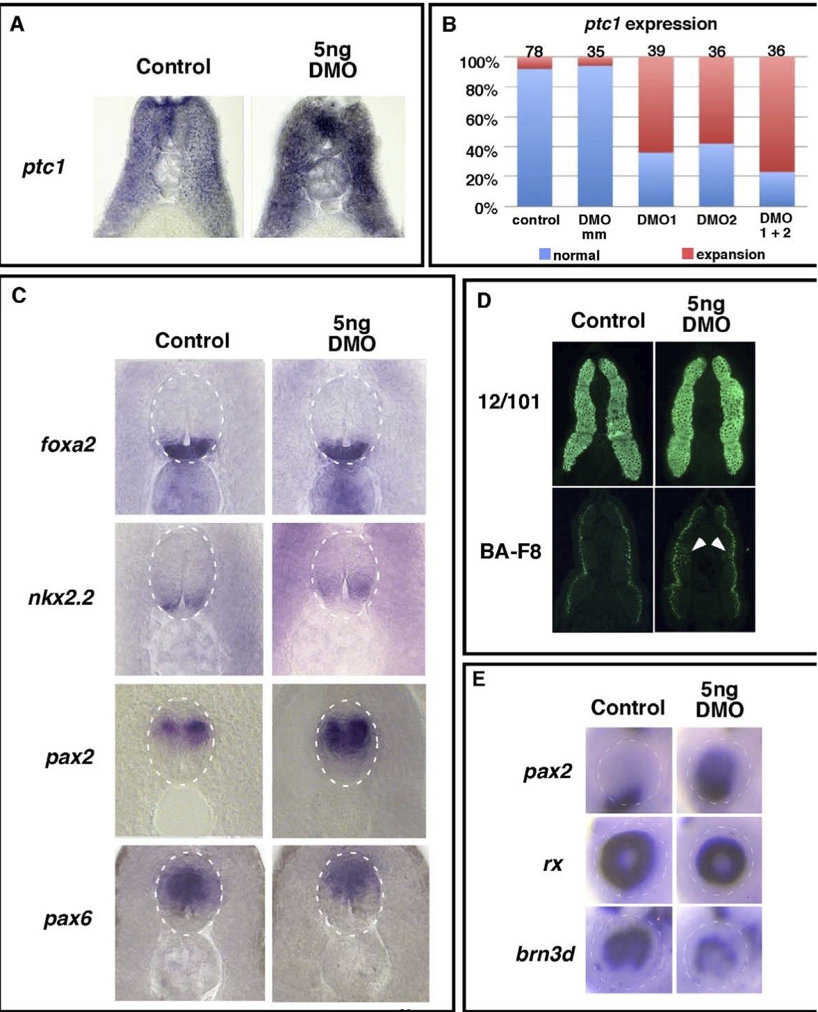 Figure 2. Partial depletion of Dzip1 increased the expression of Hh target genes in embryos. (A) In situ hybridization showing that partial Dzip1 depletion (right) markedly increased the expression of ptc1 in the neural tube and somites at stage 35. (B) Summary of the ptc1 expression phenotypes in control and morpholino injected embryos. DMO MM: 5bp-mismatch control morpholino of DMO2. (C) In situ hybridization showing the expression of floor plate markers (foxa2 and nkx2.2) and markers for more dorsal neural tube cells (pax2 and pax6) in controls (left) and embryos injected with DMO (right). The white dotted lines outline the neural tube borders. (D) Immunofluorescence showing total muscle (12/101 reactivity; top panel) and slow muscle cells (BA-F8 reactivity; bottom panel) in controls (left column) and DMO injected embryos (right column). Arrowheads denote ectopic BA-F8 reactive slow muscle cells evident in DMO injected embryos. (E) In situ hybridization showing eye patterning in controls (left) and DMO injected (right) embryos. Markers for optic stalk (pax2, top panel), total retina (rx, middle panel) and dorsal retina (brn3d, bottom panel) were analyzed. Dotted lines outline the eye.