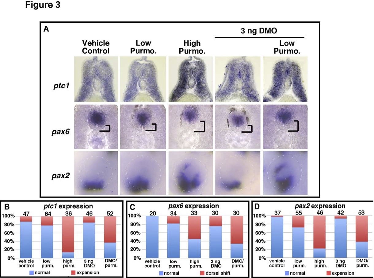 Figure 3. Partial depletion of Dzip1 sensitizes embryos to the Smo agonist purmorphamine. (A) Whole mount in situ hybridization of ptc1 (top), pax6 (middle) and pax2 (bottom) in vehicle- treated (ethanol) controls and embryos treated with either a low dose of purmorphamine (2.5 - 5.0 μm), a high dose of purmorphamine (10 μm), injected with a low concentration of DMO (3 ng) or receiving a combination of a low dose of purmorphamine and an injection with a low concentration of DMO. In the middle panels, the distance between the floor plate and the ventral border of the pax6 expression domain was highlighted. (B-D) Summary of ptc1 expression phenotypes (B), pax6 expression phenotypes (C) or pax2 expression phenotypes (D) for vehicle treated (ethanol) controls and the different groups of embryos subjected to purmorphamine, DMO or both.