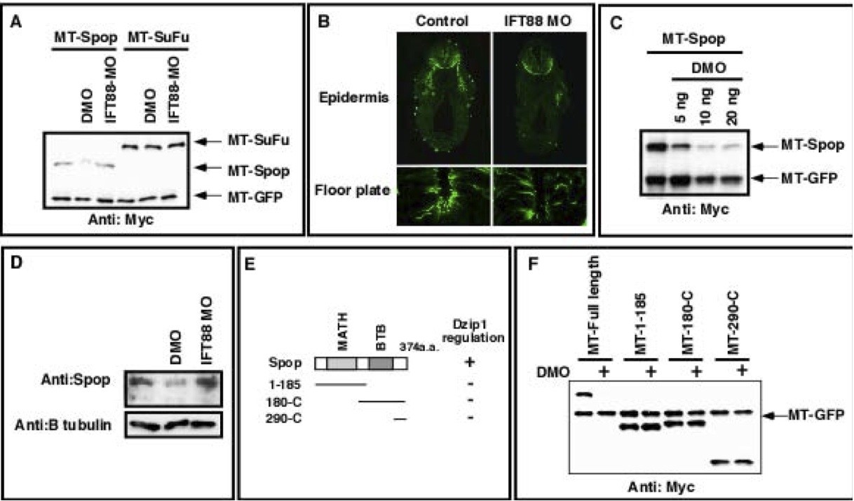 Figure 5. Dzip1 regulates the stability of Spop, independent of its role in ciliogenesis. (A) Western blot showing that the stability of Spop, but not that of Sufu, was decreased in Dzip1 depleted embryos. RNAs encoding myc-tagged (MT)-Spop (250 pg) or MT-Sufu (250 pg) were co-injected with MT-GFP (50 pg) into controls or embryos that had received a prior injection of DMO or IFT88 MO. Embryos were harvested at the neurula stage. MT-GFP serves as injection and loading control. (B) Immunofluorescence showing a significant reduction of motile cilia on the epidermis (top panel) and primary cilia in the floor plate (bottome panel) within embryos injected with 40 ng IFT88 MO (right column), compared to controls (left column). (C) DMO