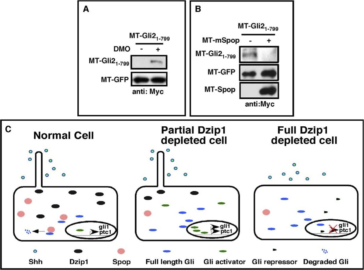 Figure 8. Regulation of Gli21-799, an analogue Gli2 mutant of zebrafish Yot, by Dzip1 and Spop. (A) Western blot results showing that knockdown of Dzip1 stabilized Gli21-799 in Xenopus embryos. RNAs encoding Gli21-799 and MT-GFP were injected into controls and embryos that had received a prior injection of DMO. Embryos were harvested at the neurula stage and subjected to Western blotting. MT-GFP served as an injection and loading control. (B) Forced Spop expression decreased the protein stability of Gli21-799. MT- Gli21-799 and MT-GFP were transfected alone, or in combination with MT-Spop into NIH3T3 cells. Cell lysates were subjected to Western blot with the anti-myc antibody to detect the levels of Spop. (C) Model of Dzip1 functions during Hh signaling. Dzip1 supports ciliogenesis and maintains the proper expression level of Gli proteins through controlling the stability of Spop (left panel). Partial knockdown of Dzip1 has no effect on the formation of cilia, but induces degradation of Spop, leading to increased levels of Gli proteins. When exposed to Shh, these cells produce more Gli activators, resulting in a more robust Hh target gene expression (middle panel). When Dzip1 is depleted more completely, ciliogenesis is disrupted. Although these cells have increased levels of Gli, they cannot receive Shh. This prevents the formation of Gli activators. Consequently, gene expression induced by Shh is inhibited (right panel). Under normal conditions, cells located at a distance from the source of Shh are not exposed to Shh. Whether these cells form cilia or not are not important. However, when Dizp1 is depleted, destabilization of Spop will induce accumulation of full-length Gli proteins (not Gli activators). This will lead to weak ectopic Hh target gene expression in embryos.