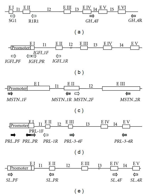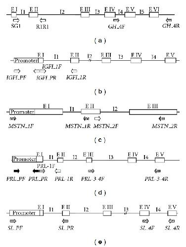 Figure 2. Structure of the candidate genes and oligonucleotide primers used for amplification by PCR in this study. Growth hormone (a), Insulin-Like Growth Factor I (b), Myostatin-1 (c), Prolactin (d), and Somatolactin (e) genes. I: Introns; E: Exons; Arrows indicate relative position of the primers.