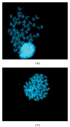 Figure 3. Localization of the myostatin-1 probe on S. aurata chromosomes. (a) MSTN-1 probe in the centromeric region of acrocentric chromosomes. (b) Localization of MSTN-1 and putative MSTN-2 genes both in centromeric regions of two different acrocentric chromosomes.