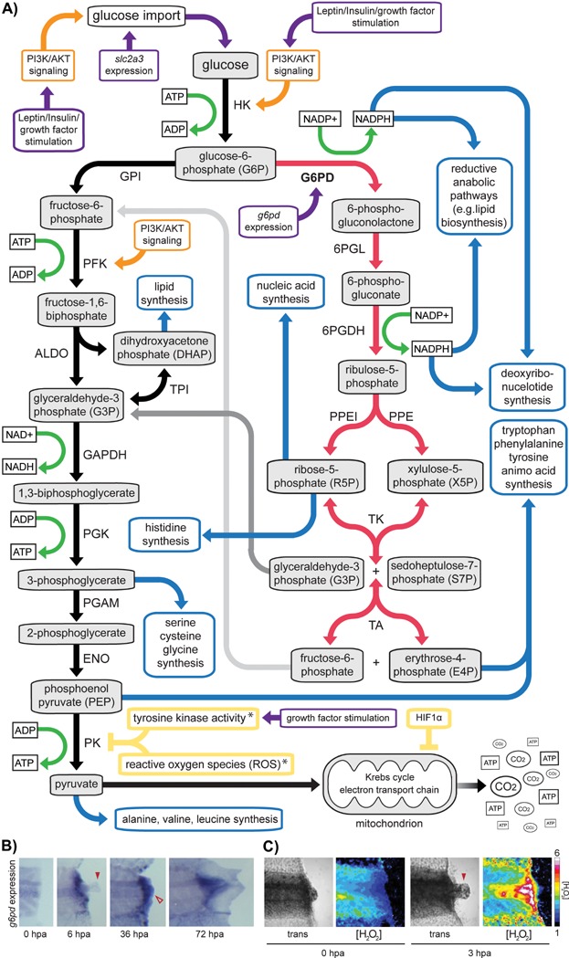 Figure 2. Production of biosynthetic precursors during glycolytic metabolism and their putative regulation during Xenopus tailappendage regeneration. A: Pathways demonstrating how glucose or its derivatives can contribute to biosynthetic processes as well as how glucose metabolism may be regulated during appendage regeneration as outlined in the essay. Diagram adapted from 13,16,24. Colors indicate conceptually different pathways or interactions: glycolysis toward glucose combustion (black); pentose phosphate pathway (PPP, shown in red); molecular contributions of biosynthetic pathways (blue); NAD/H, NADP/H, ATD/P reactions shown in green; reintroduction of PPP products into glycolysis (gray); putative inhibitory mechanisms during Xenopus tadpoletail regeneration (yellow); putative activation mechanisms during Xenopus tadpoletail regeneration (purple); putative activity of PI3/Akt given its previously characterized interactions with leptin/insulin/RTK activity 9,15. Asterisk (*) indicates that the PK inhibition by ROS and tyrosine kinase activity have been reported for the PKM2 version of the PK enzyme 19,20. Acronyms are as follows: HK, hexokinase; G6PD, glucose-6-phosphate dehydrogenase; 6PGL, 6-phosphogluconolactonase; 6PGDH, 6-phosphogluconate dehydrogenase; PPEI, phosphopentoseisomerase; PPE, phosphopentose epimerase; PFK, phosphofructokinase; TK, transketolase; TA, transaldolase; PGI, phosphoglucose isomerase; ALDO, aldolase; TPI, triosephosphate isomerase; GAPDH, glyceraldehyde phosphate dehydrogenase; PGK, phosphoglycerate kinase; PGAM, phosphoglycerate mutase; ENO, enolase; PK, pyruvate kinase. B: In situ hybridization showing expression of g6pd following amputation and during the regeneration of Xenopus tropicalis tadpole tails. Solid red arrow shows a portion of the notochord that has exited the wound site. Open red arrow shows regenerative bud tissue. C: Transillumination (trans) and HyperYFP ([H2O2]) images showing the detection of the reactive oxygen species (ROS) hydrogen peroxide (H2O2) following Xenopus laevis tail amputation using the H2O2 sensitive HyPerYFP probe 21,42. Relative levels of H2O2 levels shown in the scale found to the right of the images. Solid red arrow shows a portion of the notochord that has exited the wound site.