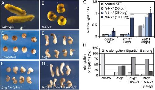 Figure 2. Fz4-v1 perturbs morphogentic movements by activation of the Wnt/β-catenin-independent JNK pathway. (A, B) Embryos were injected radially at the 4-cell stage with 1 ng fz4-v1 RNA. At tailbud stages (st. 25) 22% displayed spina bifida and neural tube closure defects (nâ=â45). (C) At the 4-cell stage 50 pg of the ATF-luciferase reporter plasmid was injected ventral-animally alone, or in combination with 100 pg (low) or 500 pg (high) wnt11 RNA and fz4-v1 RNA (5, 50 and 1000 pg). Reporter activity was analyzed at late gastrula stages (st. 12). Error bars represent SD. (*) indicate significant difference to control or wnt11 alone, respectively (grey bars) (Studentâs t test, *pâ<â0.05, **pâ<â0.001). (D-H) 4-cell stage embryos were injected at the animal pole region with bvg1 RNA (100 pg) alone, or in combination with fz4-v1 (600 pg) and jnk-apf (1 ng). At blastula stages (st. 9) the caps were explanted and elongation was scored at stage 25. (D) Non-injected controls (nâ=â20) showed no elongation but bvg1-injected explants (E) did (nâ=â27). (F) Co-injection of fz4-v1 partially inhibited explant elongation (nâ=â29), which was restored by JNK-APF (nâ=â27) (G). (H) Quantification of the animal cap experiments.